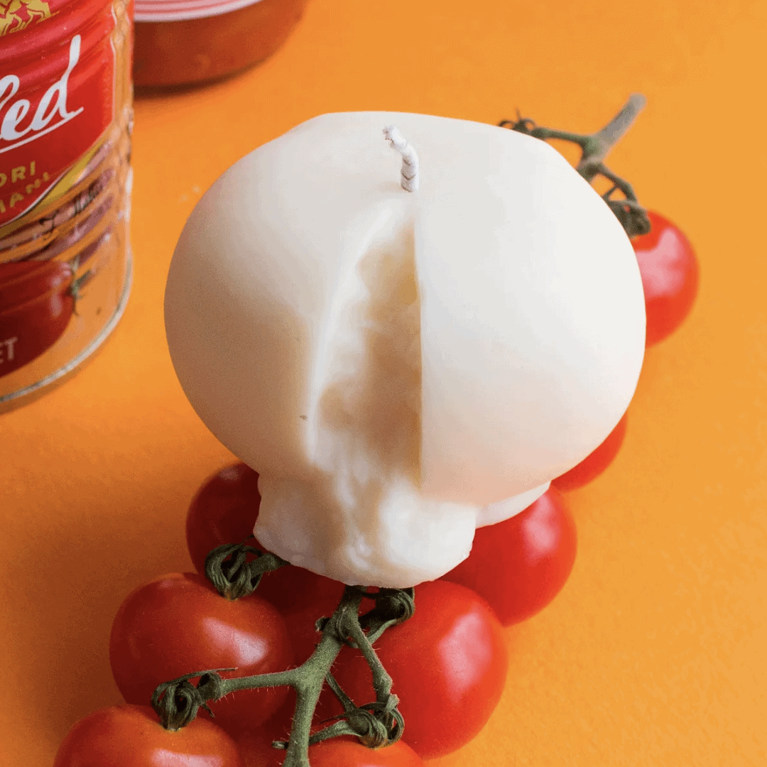 A sculptural candle shaped like a glossy orb of burrata. Almost too pretty to burn.