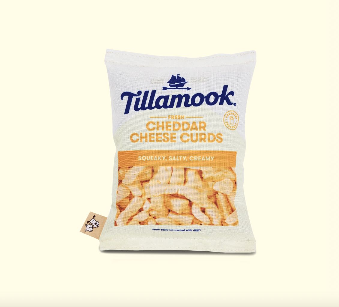 A squeaky toy styled after Real Tillamook Cheese Curds. For pups with refined taste.