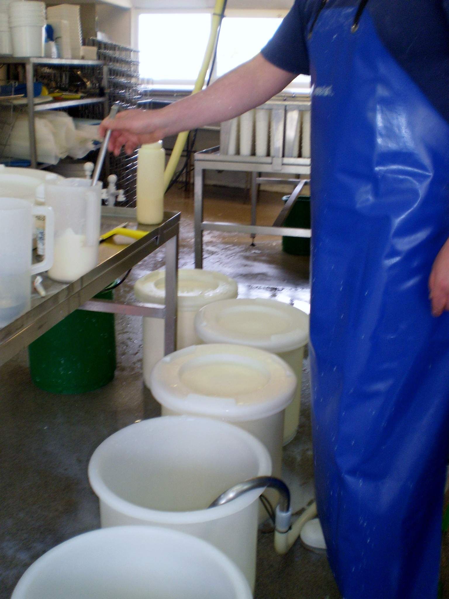 - Haydn Roberts adds rennet to individual buckets of acidifying milk and cream.