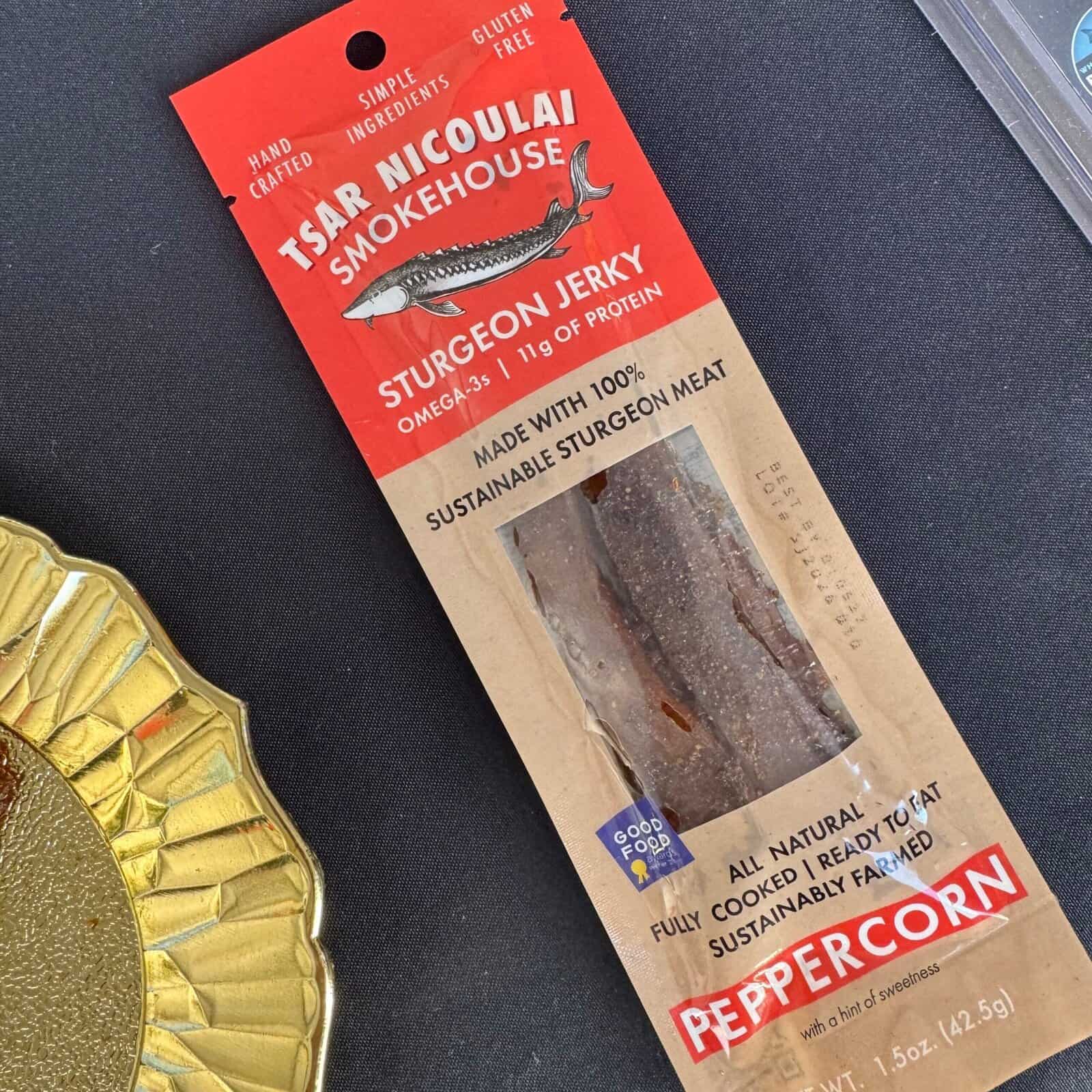 Tsar Nicoulai Sturgeon Jerky — White sturgeon jerky with a sweet-savory spice blend—smoky, snackable, and a fun left-field swap for meat sticks. Add it to boards with briny accompaniments (pickles/olives).