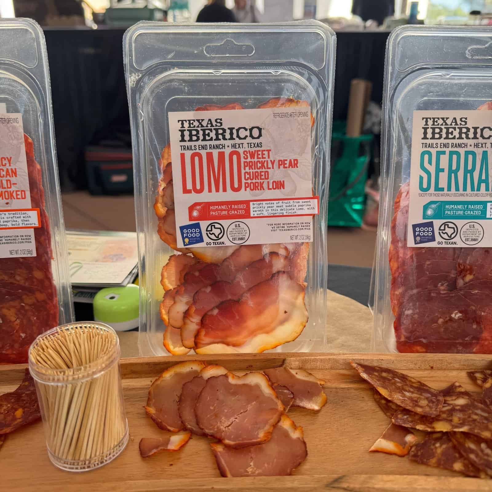 Texas Iberico Lomo, Sweet Prickly Pear Cured Pork Loin — Thin-sliced lomo cured ~60 days, marinated with prickly pear, coated with smoked paprika—umami-rich with a delicate sweetness and a gentle spice hum. Pair it with aged sheep’s milk tommes, or a nutty alpine, plus Marcona almonds to make the flavors pop.