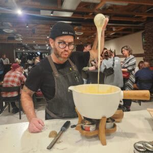 Third-generation cheese importer Adam Moskowitz has several alter egos—one of them is DJ Fondastic, who drops in with his fondue go-bag, starting a spontaneous party. This recipe is partly inspired by his many trips to Switzerland and observation of authentic Swiss fondue practices. He’s also seen folks leave the kirsch out, instead pouring it in individual shot glasses so guests can dip into the fondue pot, then dip right into the brandy.