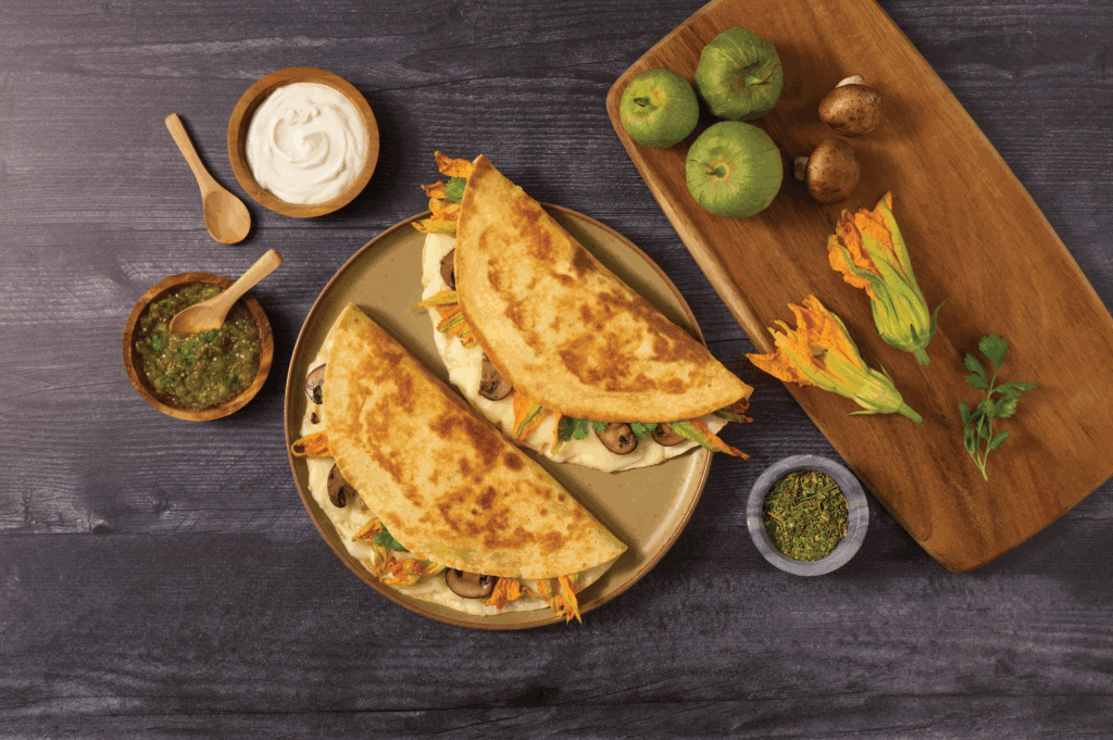 A savory, aromatic quesadilla filled with sautéed mushrooms, delicate squash blossoms, fragrant epazote, and gooey queso Oaxaca. Lightly crisped on the outside and melty inside, it’s a seasonal, floral, earthy dish perfect with salsa verde and sour cream.