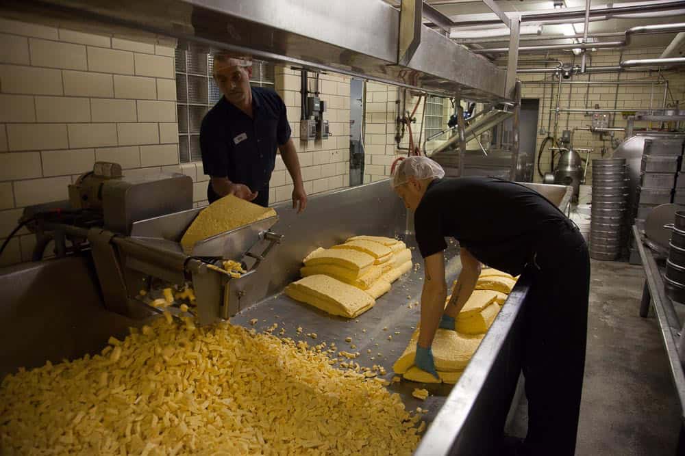 Makers at Carr Valley Cheese cheddaring a fresh batch. Cheddaring is a traditional process of stacking and flipping slabs of curd to expel whey and develop texture. The curd is then milled into smaller pieces to evenly distribute salt and halt further acid development.